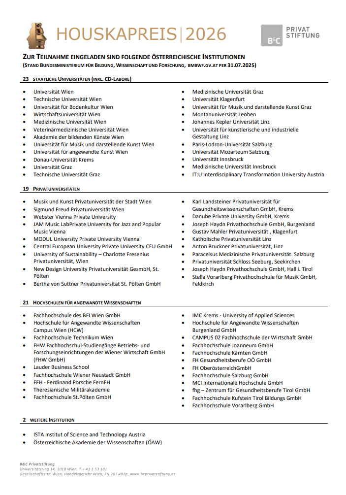Houska Prize 2026- Eligible List University Research